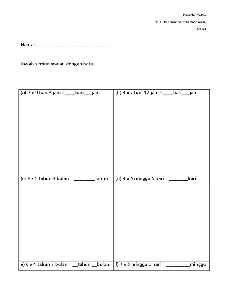 Masa dan waktu worksheets and online activities. Latih tubi matematik tahun 4. Cukup muaturun dan edarkan kepada murid untuk jawab terus soalan ini. Cukup muaturun dan edarkan kepada murid untuk jawab terus soalan ini. Jadi tidak perlu salin soalan daripada buku teks. Dipersilakan muat turun latihan topikal matematik tahun 4 unit 1 nombor dan operasi. Masa dan waktu tahun 4 | tambah hari dan jam dalam video ini anda akan belajar 2 jenis soalan melibatkan operasi tambah . Bulan = masa dan waktu 1 hari = 24 jam.